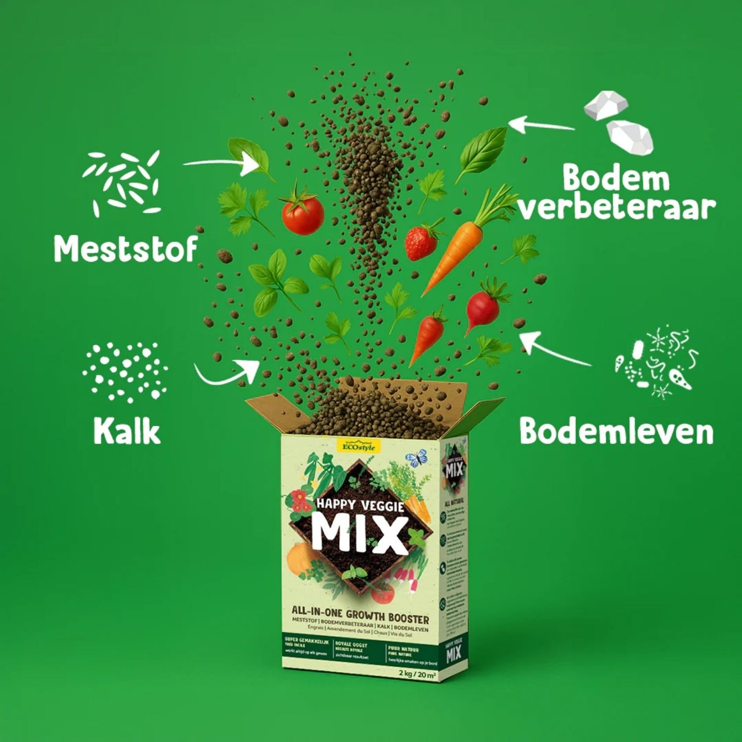 Geef je moestuin de voeding en zorg die het verdient met ECOstyle Happy Veggie Mix, een natuurlijke all‑in‑one groeibooster die je groenten, kruiden en fruitplanten optimaal ondersteunt. Deze complete mix combineert meststof, bodemverbeteraar, kalk en actief bodemleven in één product, zodat je bodem optimaal werkt en je planten sterker groeien, voor een rijke, smaakvolle oogst uit eigen tuin.