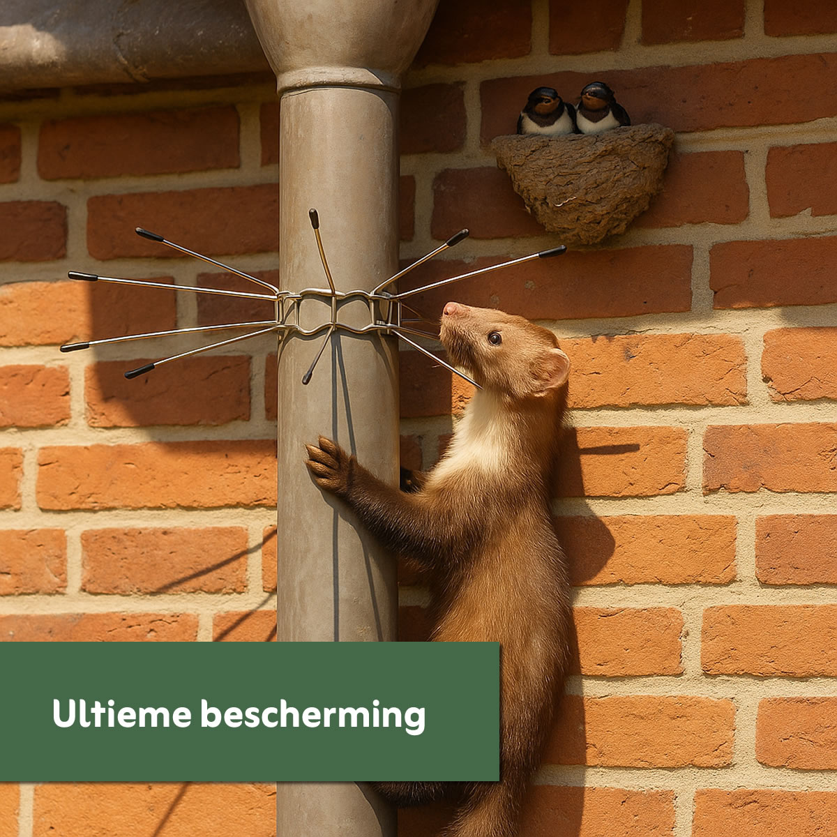 - Toepassing: op regenpijp/valpijp; voorkomt opklimmen naar dak/zolder