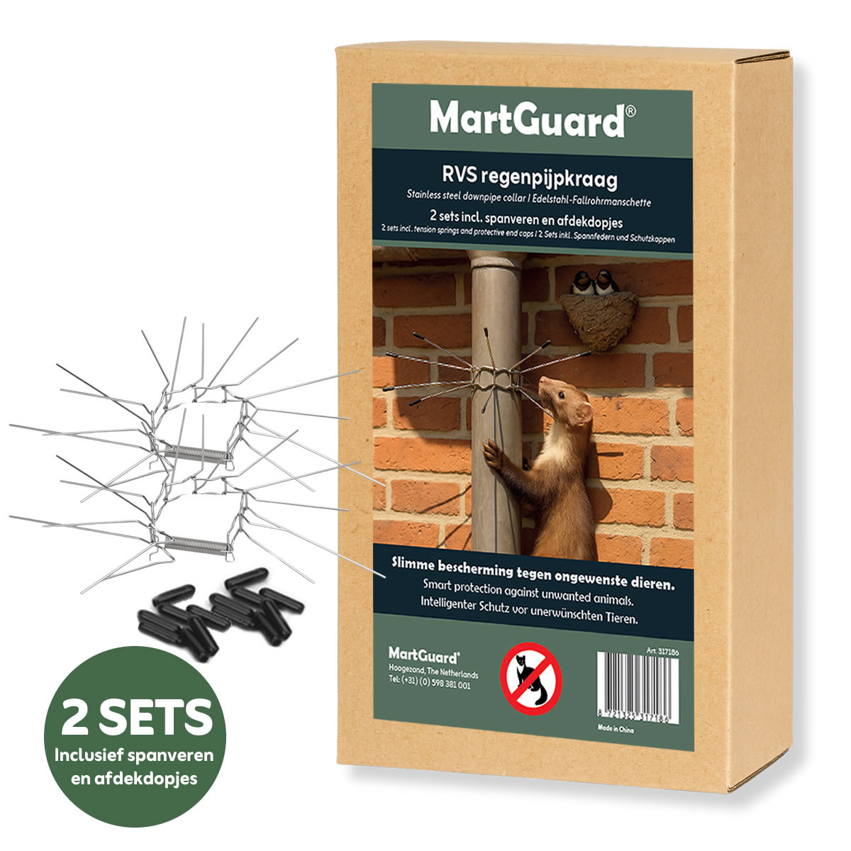 Voorkom dat marters, katten en andere klimmers via de regenpijp je dak of zolder bereiken. Deze stevige, boorvrije “kraag” klik je rondom de regenpijp; de roestvaste stalen pinnen vormen een doeltreffende barrière, terwijl kunststof eindkapjes contact met huid of vacht verzachten. Dankzij de handige spanveer stel je de ring in op de juiste maat voor regenpijpen tot Ø 12 cm.