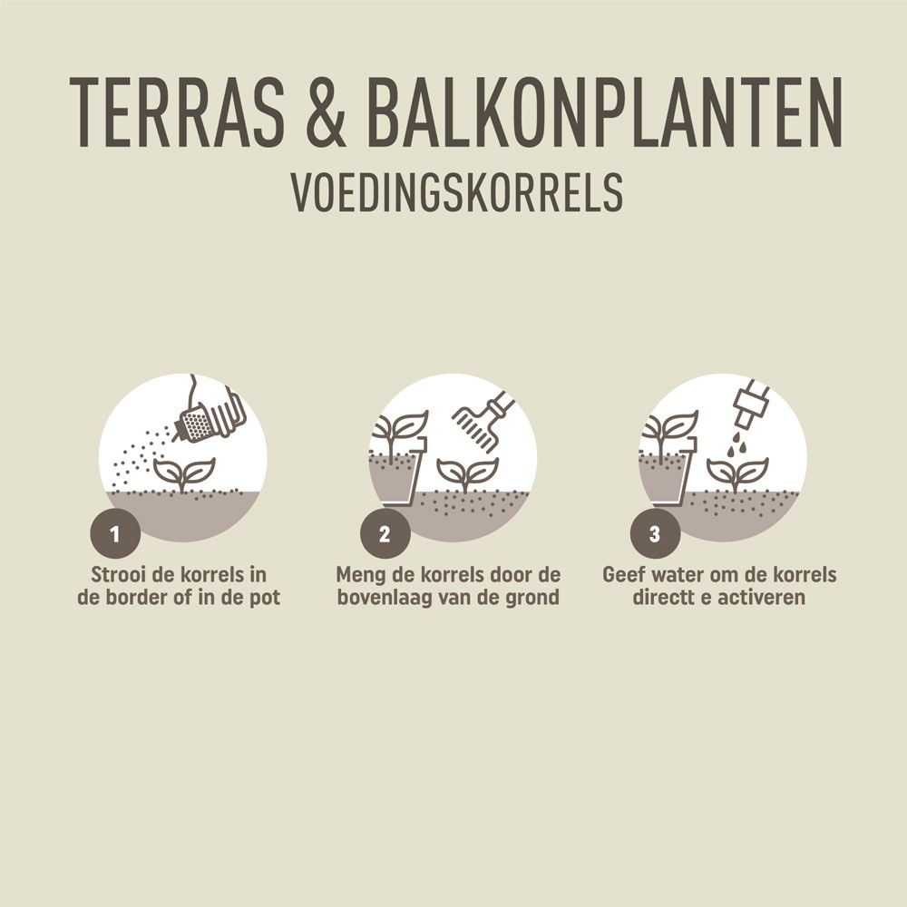 - Toepassing in potten: Meng de korrels goed door de potgrond voordat je de pot vult en geef daarna water om de voeding te activeren.